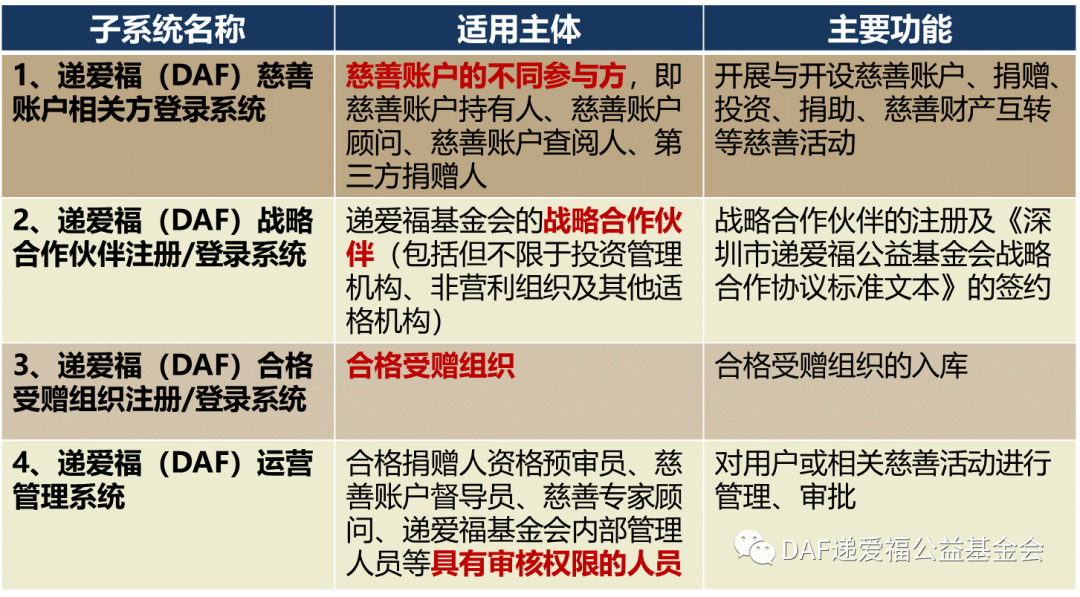 (3)从技术层面来:递爱福基金会搭建了一个共享化的专业管理技术平台,开发了“递爱福(DAF)账户服务系统”。