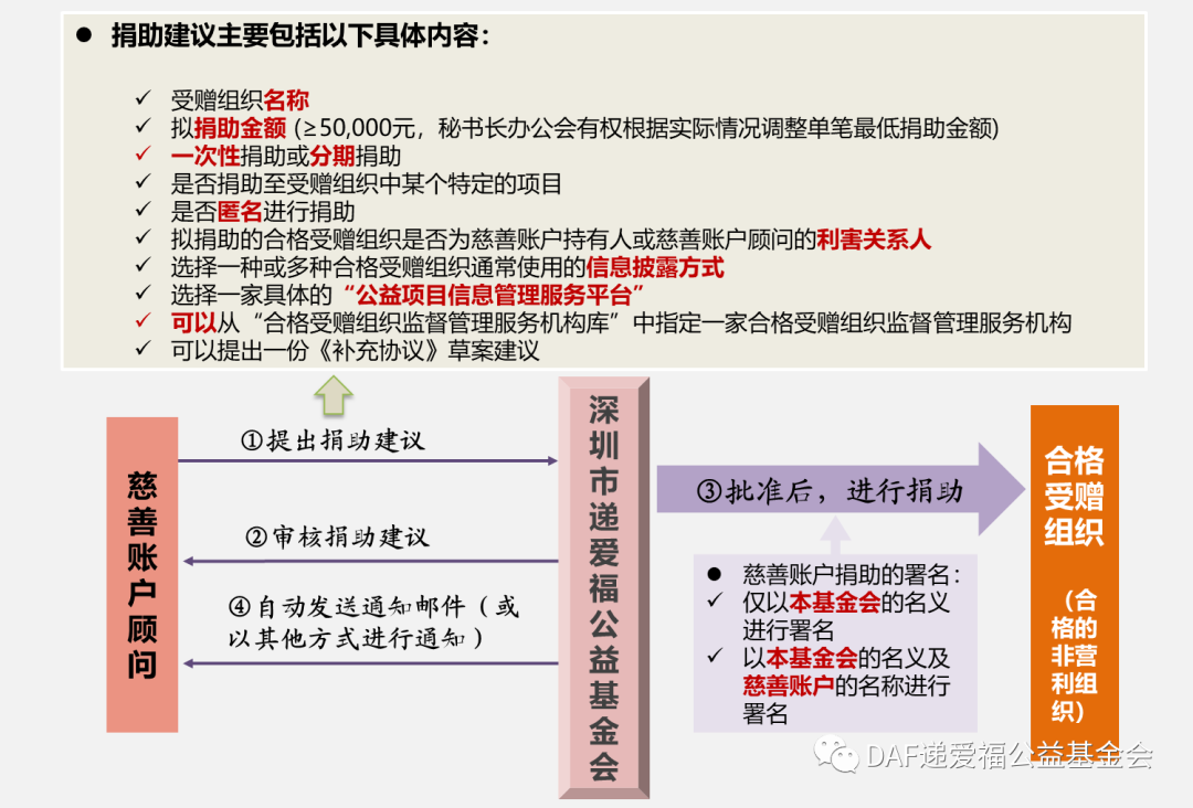 在捐助的环节,具体的捐助建议由慈善账户顾问在线提出,经基金会审核批准后,由递爱福基金会向合格受赠组织进行捐助。