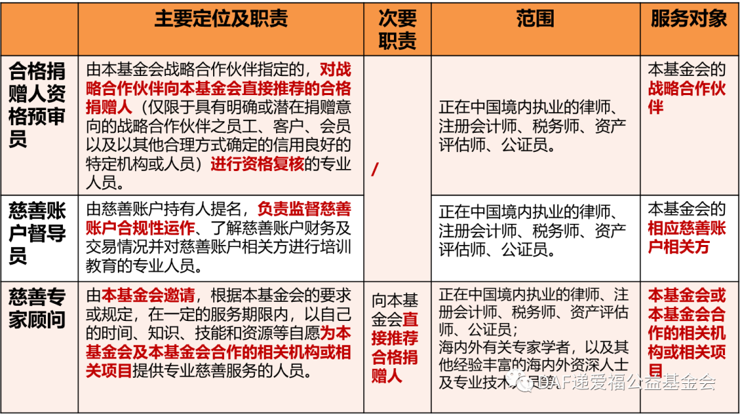 递爱福基金会设置了合格捐赠人资格预审员、慈善账户督导员以及慈善专家顾问三类由专业人员担任的角色,属于专业志愿者,主要由正在中国境内执业的律师、注册会计师、税务师、资产评估师、公证员等专业人员担任。