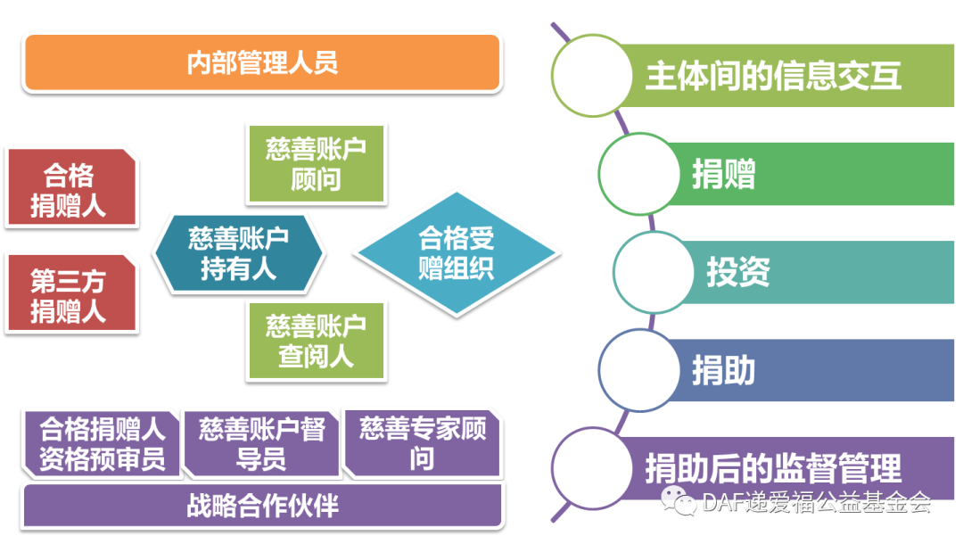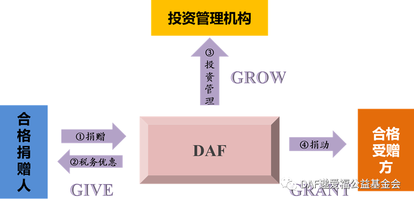 (1)Give:指捐赠人开设慈善账户,将慈善财产捐赠至DAF,并取得相应的税收优惠;