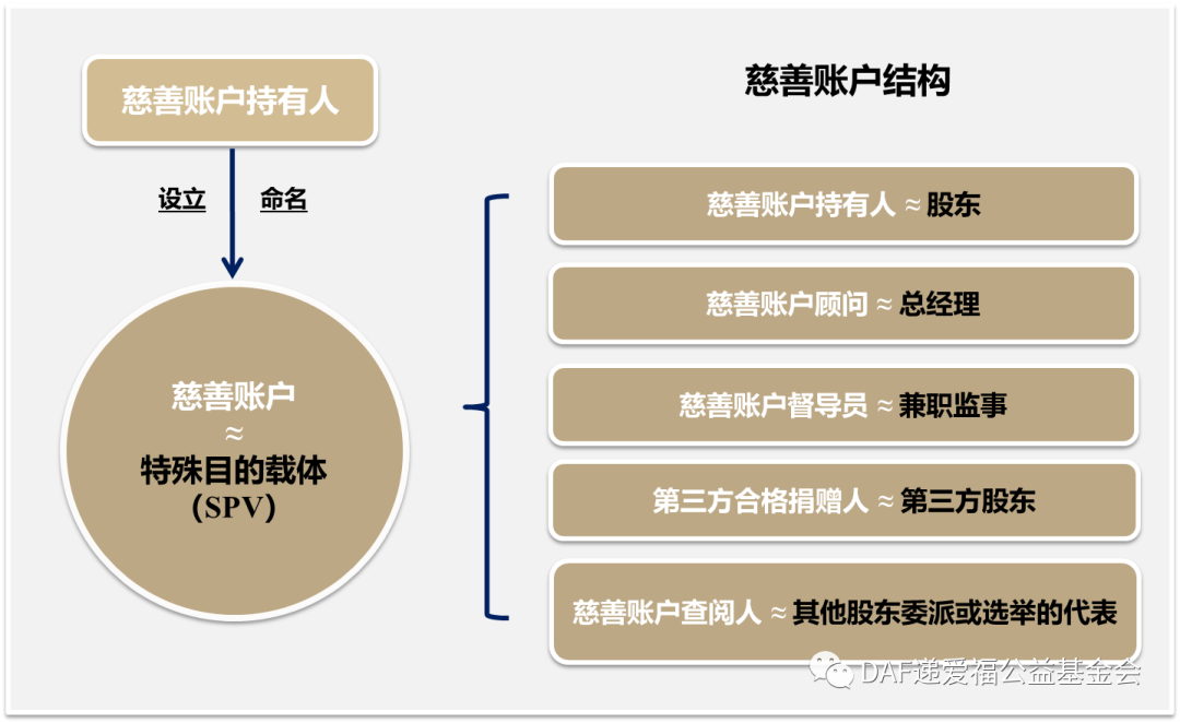 慈善账户持有人申请设立的“慈善账户”,可以理解为一家特殊目的载体(SPV,Special Purpose Vehicle), 慈善账户持有人有权对“慈善账户”进行命名。慈善账户持有人相当于SPV的股东,慈善账户顾问相当于SPV的总经理,慈善账户督导员相当于SPV的兼职监事,第三方合格捐赠人向SPV的捐赠,相当于第三方股东向SPV出资,慈善账户查阅人相当于SPV的其他股东委托或选举的代表,来监督SPV的活动。