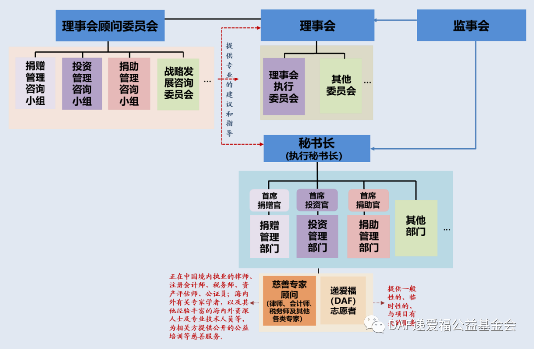 递爱福基金会的内部管理架构,包含了理事会、理事会顾问委员会、秘书长办公会,以及监事会。其中,理事会顾问委员会下设有捐赠、投资、捐助管理咨询小组,以及战略发展咨询委员会,为基金会提供专业的建议和指导。