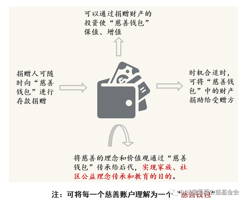 捐赠人可在DAF基金会开设慈善账户进行捐赠。每个DAF慈善账户,像是一个“慈善钱包”,捐赠人可以随时向这个“钱包”进行“存款”(捐赠),可以通过慈善财产的投资,使“钱包”保值、增值,并可以在合适的时机,通过向合格受赠组织捐助,来花费“钱包”中的慈善财产。此外,该“慈善钱包”可以传承给后代。
