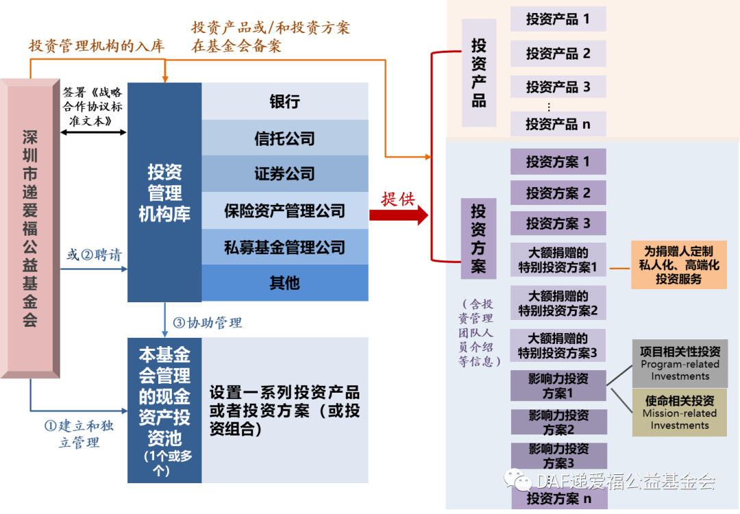 递爱福基金会将与不同的投资管理机构,如银行、信托公司、证券公司、保险资产管理公司、私募基金管理公司等建立战略合作关系,组建“投资管理机构库”。