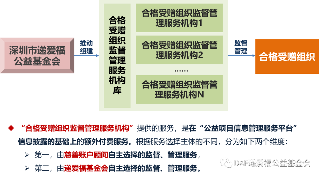该监督管理服务需由“合格受赠组织监督管理服务机构”提供。该机构的服务内容,是对合格受赠组织的慈善财产的具体使用情况和慈善项目的具体执行情况,以及最终受益人的受益情况等信息进行管理、监督、披露和评估,并向递爱福基金会和慈善账户相关方,提供全面、详细、专业的评估报告。