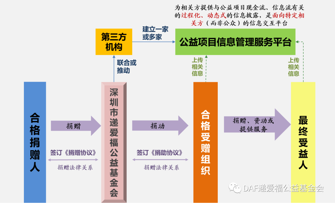 (1)从资金流动的角度来说,双方建立的是捐赠法律关系,递爱福基金会作为捐赠人,合格受赠组织作为受赠方;