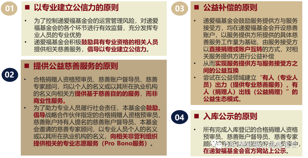 专业人员的管理与服务,主要会遵循4个基本原则,即以专业建立公信力的原则、提供公益慈善服务的原则、公益补偿原则,以及入库公示的原则。相关具体内容可见下图: