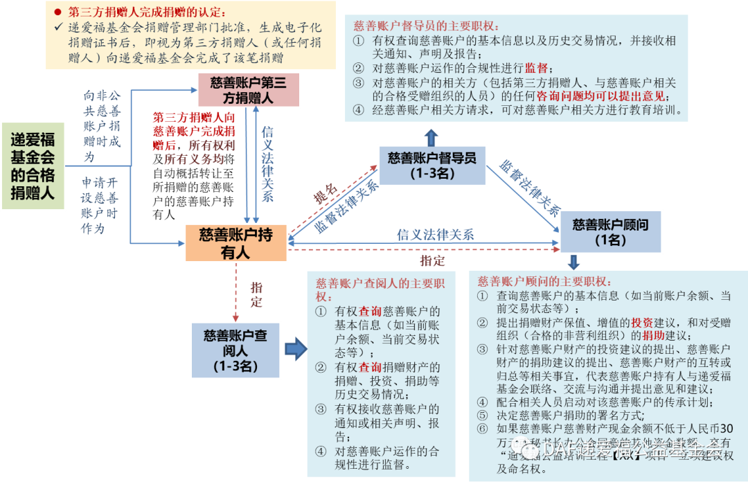 第三方捐赠人与慈善账户持有人之间是信义法律关系,相当于他向这个慈善账户完成捐赠之后,他的所有权利义务,将自动、概括转让给慈善账户持有人。
