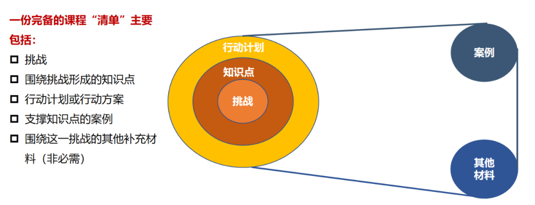 在递爱福家办的品控体系下,评判一个课程是否完备,需要看课程是否具有相关的要素,也就是:是否有在课程中提出“挑战”,并围绕“挑战”形成知识点、提出行动计划或行动方案。同时,围绕着这些知识点,还有可以支撑的案例以及其他补充的材料。