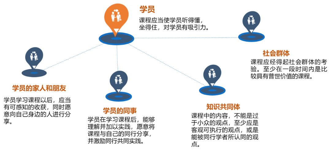 递爱福家办“产品”主要面向的学员是“专业人员”,具体来说,这些专业人员可以分为三类:第一类是财、税、法的专业服务人员。例如,律师事务所、会计师事务所、税务师事务所等专业服务机构中的专业人员。第二类是财富管理领域的专业从业人员。例如,私人银行、保险信托等金融机构、第三方财富管理机构、家族办公室的专业从业人员。第三类是其他领域的专业人员。例如,慈善领域从业人员、商界、媒体、教育、政府等各界具有公益慈善理想和志趣的专业人士。为了体现递爱福家办课程设置的专业性及指导性,确保课程的质量和学习效果,递爱福家办将设立严格的课程老师准入标准,对课程老师采用严格的邀请制度,也就是邀请具备较强专业能力、较高公信力的海内外优秀从业者、专业人员、学者等担任课程老师。此外,金融机构、财富管理机构等专业机构都可以向递爱福家办推荐符合准入标准的专家成为课程老师,评审通过后,递爱福家办可以向该专家发出定向邀请。递爱福家办课程所提供的这些知识产品,核心的功能就是为学员提供公益慈善及相关领域层层递进的知识、技能和认知。具体来说,就是通过学习递爱福家办课程,获取公益慈善、家族传承、公益金融、捐赠者建议基金(DAF)等相关领域的专有知识和具有实操性的新技能,进而实现对学员以往认知的更新。递爱福家办的课程除了能让学员有所收获以外,还辐射到了更多的群体,比如学员的家人、朋友和同事,还有其他知识共同体和社会群体。学员学习完这些课程以后,能有可感知的收获,愿意向自己身边的家人朋友进行分享。同时,能够将这些知识加以实践,将课程与自己的同行分享,并激励同行共同实践。这也要求课程中的内容不能是过于小众的观点,至少应该是客观可执行的观点,或是能被同行学者所认同的观点。课程也应当能够经得起社会群体的考验,至少在一段时间内是比较具有普世价值的课程。