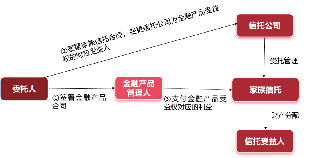在信托结构上,首先,委托人与金融产品管理人签订金融产品合同,此时委托人就享有了金融产品受益权。接下来,委托人与信托公司签订家族信托合同,设立家族信托,并变更信托公司为金融产品受益权的对应受益人,这一步实现了信托财产的交付。未来,当金融产品变现,对应的利益就由金融产品管理人支付给家族信托,由信托公司投资管理,并最终支付给信托受益人。金融产品受益权作为信托财产设立家族信托,核心的信托财产交付环节都是采用了变更对应金融产品受益人的方式,因此信托的架构较为类似。