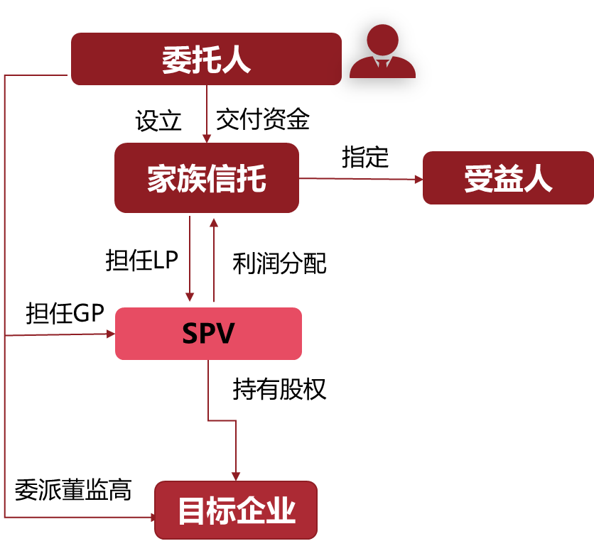 在这个架构中,合伙企业SPV层面,本身是由GP来负责企业的管理,根据合伙企业法,信托作为LP不能参与企业的具体运营。所以,实际上就是由委托人控制的GP在管理合伙企业,进而管理家族企业。此外,在目标公司层面,委托人还可以通过委派董事、监事、高级管理人员的方式对目标企业进行一定管理。