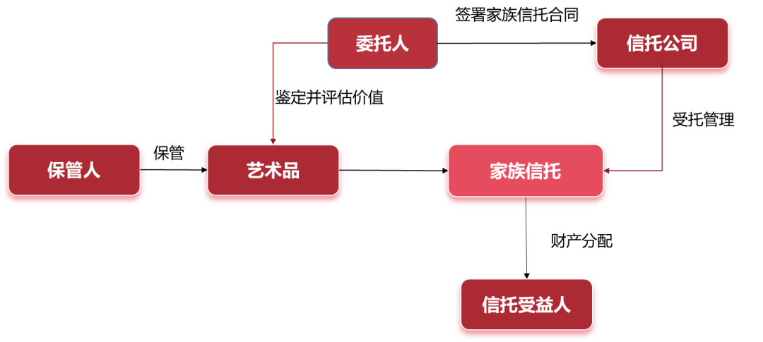 在信托结构上,委托人首先需要对艺术品进行鉴定和评估,然后将相关艺术品的所有权人变更为信托公司(代表家族信托)。另外,考虑到信托公司一般不具备保管该等艺术品的条件,信托项下会设置保管人,由专业的保管机构保管该等艺术品。