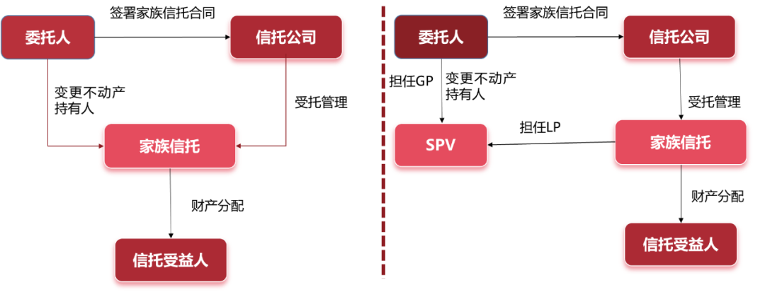此处列示两种不动产家族信托的架构,即家族信托直接持有不动产和通过SPV持有不动产。实务中,具体选择何种架构很大程度上取决于税负的影响以及对于不动产经营与未来变现的考虑。