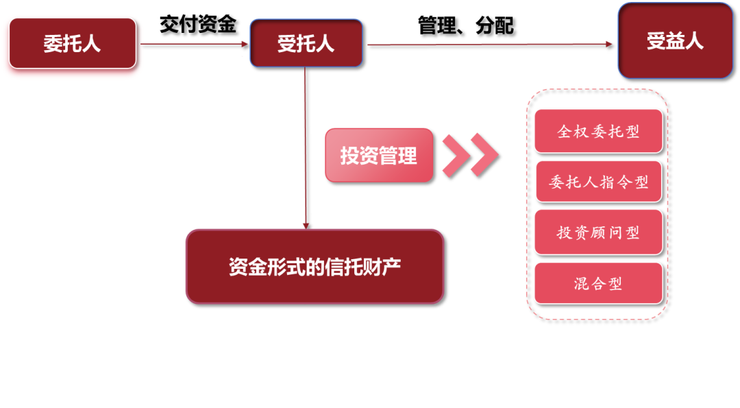 资金型家族信托是委托人交付其合法所有的资金给受托人并设立家族信托,由受托人根据信托合同的约定管理运用信托财产,并向受益人分配信托利益。信托资金投资管理的方式包括:全权委托型、委托人指令型、投资顾问型、和混合型。在这四种模式下,信托财产的投资运用决策者不同,相应的,信托投资运用的指令发送和行使流程也有所不同。