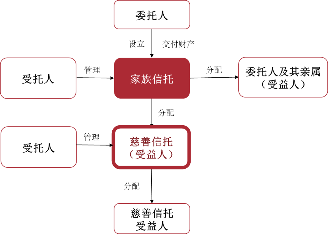 在信托结构上,委托人设立家族信托,并指定其亲属和慈善信托作为家族信托受益人。在这个双信托架构中,家族信托实现了财富传承管理的私益目的,同时,家族信托的资金源源不断地流入慈善信托,又实现了慈善信托的公益目的,实现了双信托长远稳定的存续。此外,委托人亲属作为家族信托的受益人,同时也可以作为慈善信托的监察人或者具体慈善活动的执行人,这样可以让子女深入地参与慈善活动。