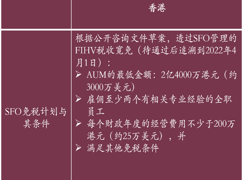 这个优惠政策与新加坡的政策结构一样,也需要有两家公司,即基金公司和基金管理公司,但基金公司的资产门槛只有一档,就是2.4亿港币,折合约3000万美元,与新加坡13U的5000万新币的水平差不多,其他条款也基本相同。