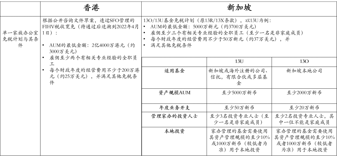 下表是对香港和新加坡家办相关税收政策的主要条款比较: