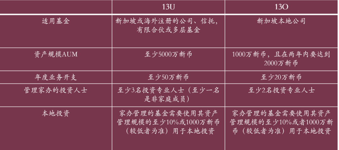 主要的意思就是,在新加坡成立家办,需要有两个公司,即基金公司和基金管理公司。对于基金公司,有一定的资产规模要求,13U是5000万新币,13O是2000万新币。同时,还要成立一个基金管理公司,管理费13U至少50万新币,13O至少20万新币。