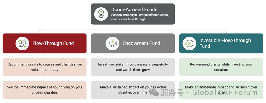 据介绍,CFS根据DAF账户资金的投资与使用方式,为捐赠人提供了三种类型的DAF,分别是:流经基金(Flow-Through Fund)、捐赠基金(Endowment Fund)以及投资性流经基金(Investible Flow-Through Fund)。具体来说,流经基金在DAF账户中停留的时间最短,捐赠人将不会进行任何投资,并可以立即开始支持慈善机构;捐赠基金则是捐赠资金在DAF账户中会持续留存并进行投资,每年都将投资的收益用于支持慈善机构;投资性流经基金则介于两者之间,投资收益和本金都可用于捐赠人选择的慈善事业。
